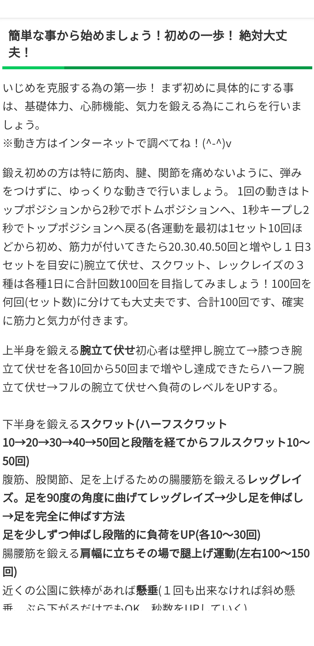 護身術、いじめ対策 いじめ克服に必要な大事な基礎の鍛え方を紹介いたします。 これらを実践すれば動ける必要な筋力がつきます(^-^) 腕立て伏せ(壁押し腕立て伏せ)20➡️30➡️40➡️50回できたら➡️ 膝つき腕立て伏… 続きを読む 筋トレ① 腕立て伏せ、スクワット、レッグレイズ、懸垂